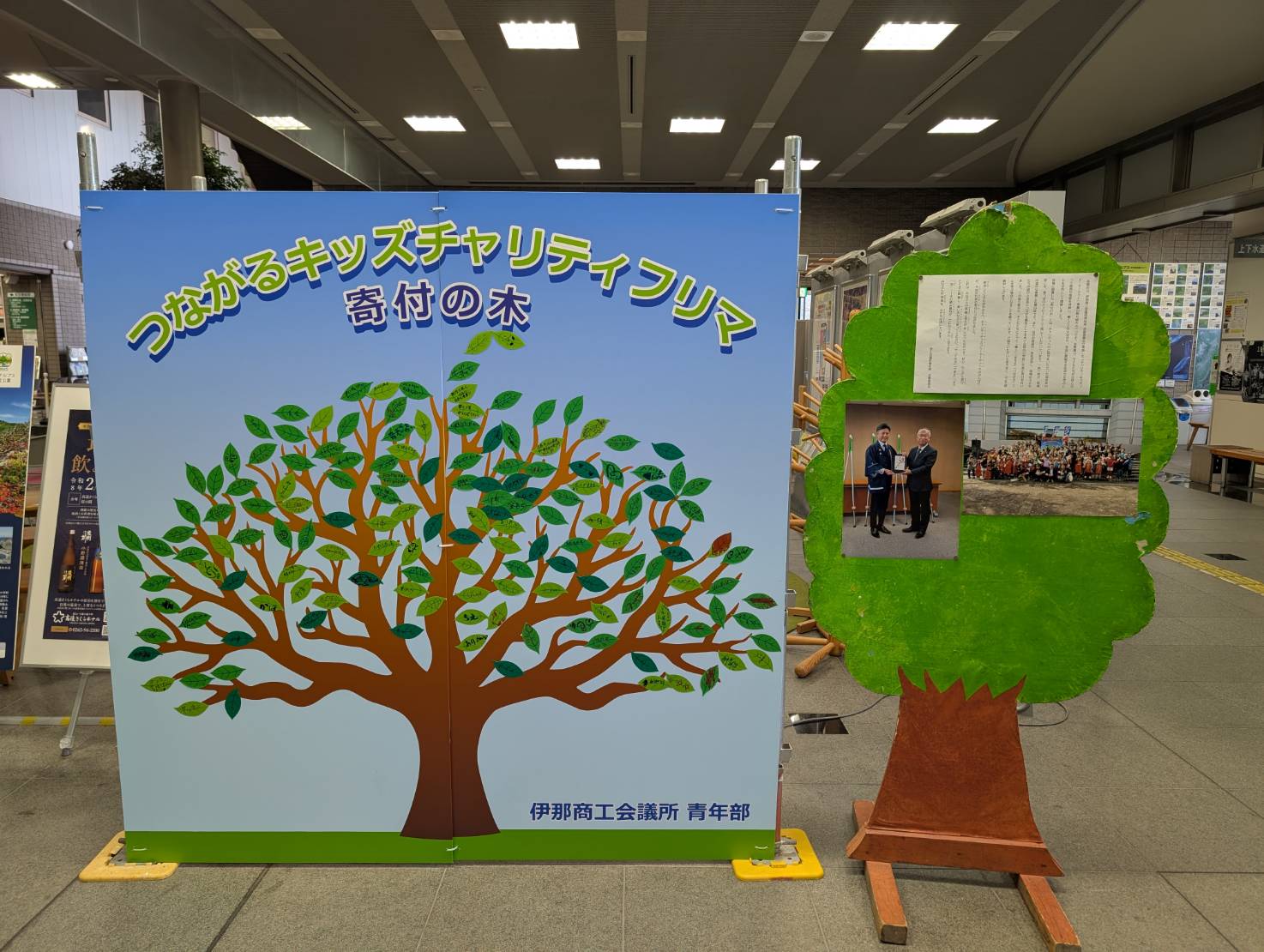 さらに、本事業の取り組みを広く知っていただくため、伊那市役所ロビーにて「寄付の木」および贈呈式の写真を1週間展示させていただきました。来庁された多くの市民の皆様にもご覧いただき、地域全体で子どもたちを応援する機運を共有する機会となりました。